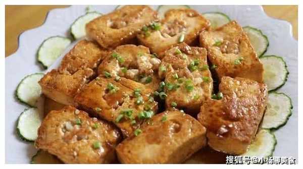 2、豆腐切丁,用中火煎定型並成金黃色盛出。
