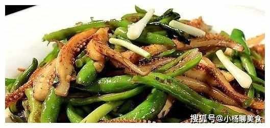 5.薑沫,青椒,魷魚一起炒,青椒變色後,放鹽,料酒,放少許水,悶1分鐘即可,放味精即可上盤