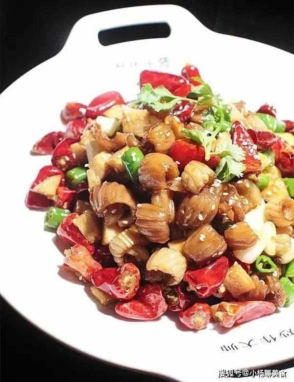4.鍋裏放入鹵油燒熱,下子彈頭幹辣椒、紅花椒、幹青花椒熗香後,倒入炸好的主配料和青紅椒節(或青紅椒條)快速爆炒,其間加少許冬菇醬油和蚝油調味,便可起鍋裝盤上桌。