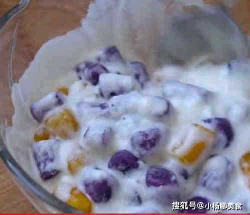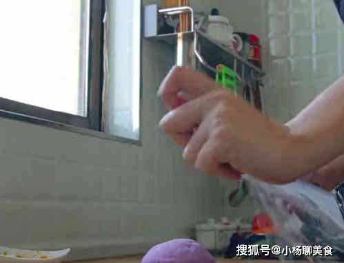 準備五分之一袋的木薯澱粉,用燒開的開水把木薯澱粉燙一下,攪拌均勻攪成麵糊把紫薯放進去,揉成麵團,用保鮮膜把紫薯團包起來,防止乾裂,南瓜的做法和紫薯一樣