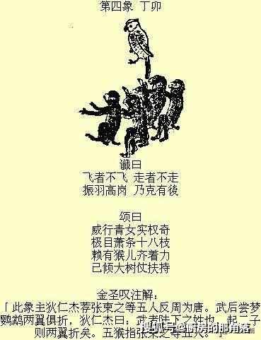 "武則天退位"的預言,是《推背圖》的"第四象",這幅"圖",說來也並不複雜,上面就是畫了一隻鸚鵡和五只猴子而已,就連幼儿園裏的小朋友,也能够一眼認出。不過,玄機往往就隱藏在看似簡單的事情的背後,那麼,這幅"圖"的玄機又是什麼呢?