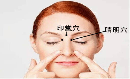 揉睛明:雙手食指旋轉揉按(內眼角稍上,輕輕按壓有一個凹陷處即為睛明穴),此處可緩解鼻塞流涕症狀。