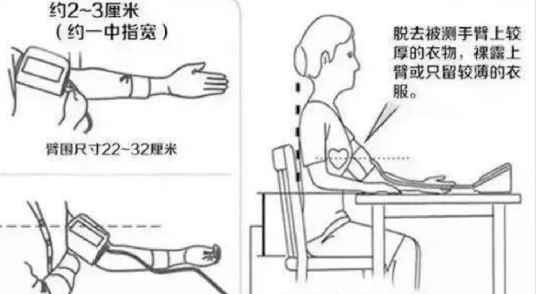 定位置:量測血壓時人應取坐位,脫去檢測側手臂上的衣物,將手臂自然伸展平放於與心臟相同高度的案頭。使用左側上臂或右側上臂均可,但每次量測時都測同一處,一般習慣使用右手的人建議以右側上臂血壓為觀察值。將量測的袖帶套入上臂,使得與袖帶相連的橡膠管在前臂一側,袖帶大約離肘關節約2-3cm。