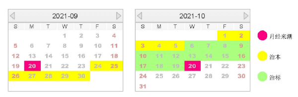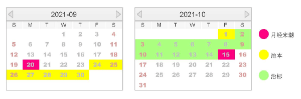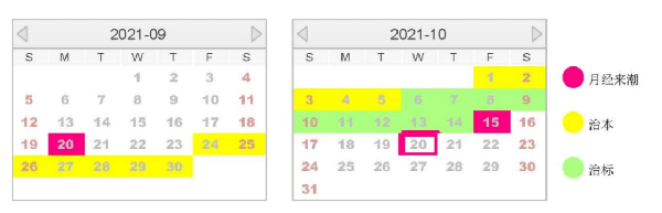 月經來潮的第5天起治本,應在9月24日起服用治本的中藥,臨床上可配合院內製劑:貞蓉消癖口服液、蠍甲消癖口服液等同時服用。