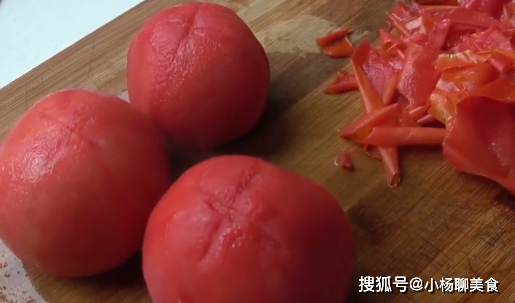 燒一鍋開水,水開後倒入,把蕃茄燙一下,去皮。