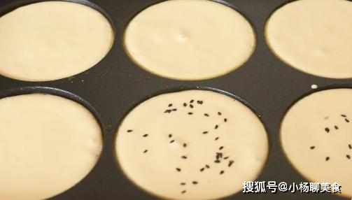 把發好的米漿攪拌一下,排出裡面的空氣,在餅鍋裏刷油,把攪好米漿糊直接舀入餅鍋裏,裝8分滿,然後在表面撒上黑芝麻。
