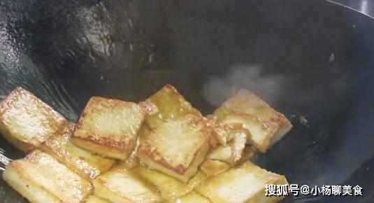 鍋裏倒油,燒熱,把豆腐切片煎至兩面金黃。