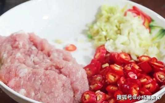 把猪肉用溫水清洗乾淨,剁成肉末備用。再切點紅椒,蒜末,薑末