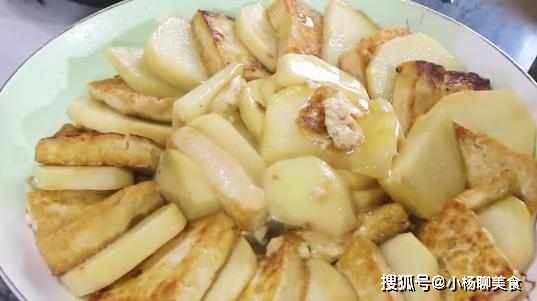 倒入切好的土豆片,加鹽,生抽,翻炒幾下入味就可以出鍋。然後擺盤,一片洋芋一片豆腐把它放到盤子擺好。