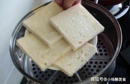 取吐司片,把四周的硬邊切掉,裝進碗裏,放進剛剛蒸紫薯的蒸鍋裏,不用開火,用鍋裏的餘溫把麵包片熱一下,讓麵包片變軟。