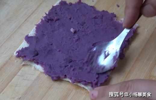 熱好的麵包片用擀麵杖壓扁,壓結實一些,然後均勻的抹上紫薯泥。