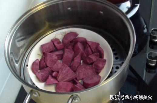 紫薯去皮,切塊,蒸20分鐘。筷子能輕易搓透紫薯即可。