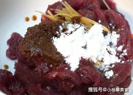 再切點薑絲,放進牛肉裏,再倒入生抽,1大勺沙茶醬,1勺澱粉,用手抓均勻。
