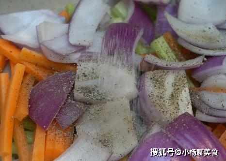 利用醃制牛肉的時間,把芹菜葉處理掉,清洗乾淨切段,胡蘿蔔切條,洋葱切成小塊,都裝進碗裏,加入黑胡椒粉和適量鹽,攪拌均勻。接著把金針菇根部切掉,撕成小朵,清洗乾淨,瀝幹水分。