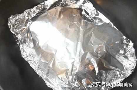 牛肉鋪好後,把錫紙折起來,收口往裏卷,這樣湯汁就不會漏出來。然後把包好的牛肉,放進鍋裏,蓋上蓋子,用中火燜10分鐘。