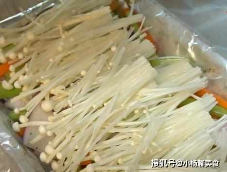 把錫紙鋪在一個盤子裏,把攪拌好配菜倒入到錫紙的凹槽裏,再鋪上清洗乾淨的金針菇。