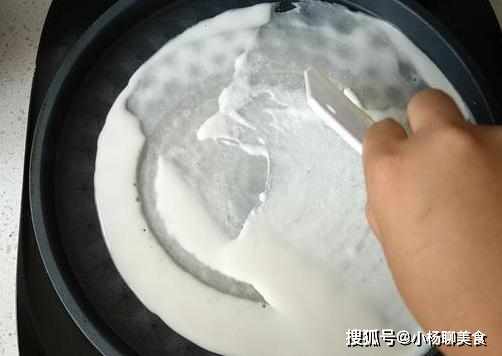 開小火,電餅鐺裏不要放油,鍋微熱倒入2勺麵糊,刮板快速刮均勻,烙制1分鐘左右,餅縮小,水分揮發,這時的餅很有勁道和韌性,翻面時也不會破損。
