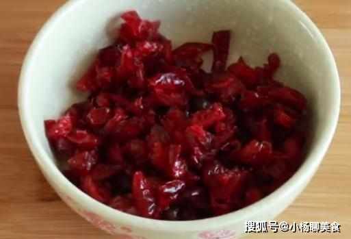 把準備好的蔓越莓(或者用葡萄乾,堅果仁都可以)切碎裝進碗裏。