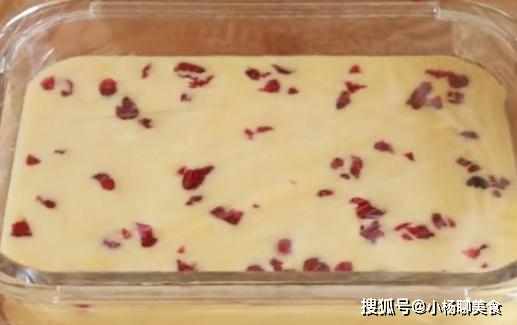 食材:200克純牛奶(或者優酪乳),2個雞蛋,100克低筋面粉,10克白糖,適量蔓越莓