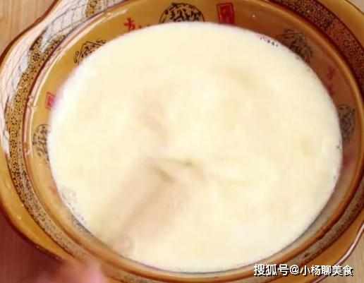 然後倒入200克純牛奶(或者優酪乳),繼續攪勻。