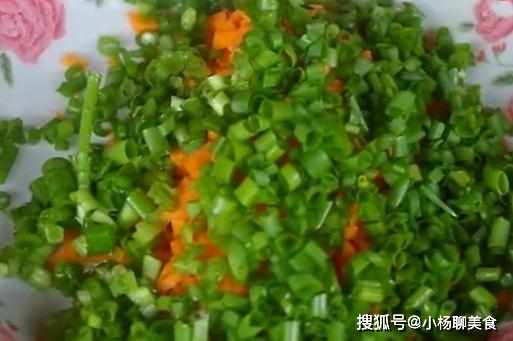 利用發麵的時間,把1根胡蘿蔔切丁,幾根小葱清洗乾淨切碎備用。
