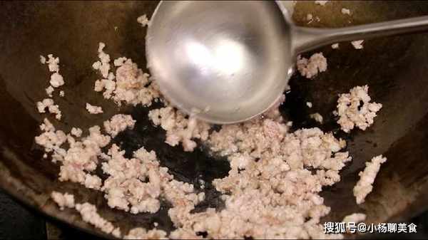 6、熱鍋凉油,油熱放入肉末,肉末炒至發白
