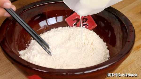 2、如果天氣比較冷的話,可以把牛奶稍微溫熱一下,用溫水和麵,這樣麵粉發酵比較快