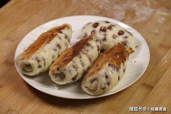 8、將劑子擀成薄餅,煮好的紅豆放餅上面,像包包子一樣包起來,將口封住,按壓一下,然後擀成長餅,從一頭卷起來,這樣就可以了