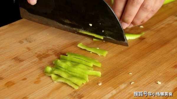 2、青辣椒去頭去籽,將辣椒切成條