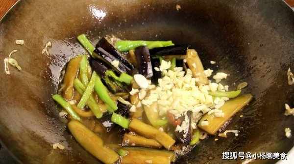 7、茄子超軟放入料汁,放入蒜末,大火收汁