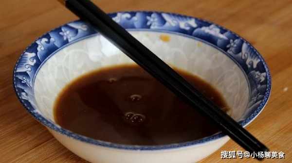 4、調一個料汁,放點雞精,十三香,少量白糖,來點生抽,一點蚝油,放點澱粉,再加點清水攪拌均勻備用