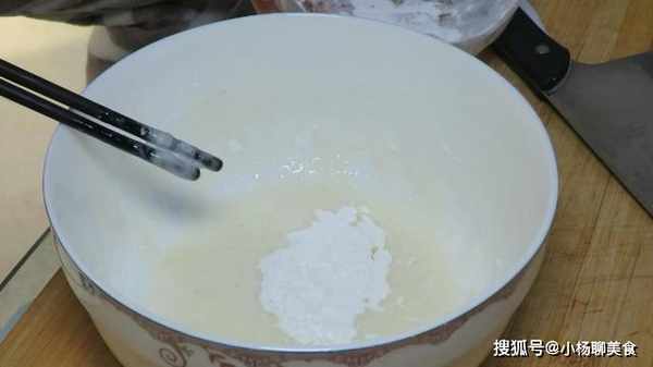 2、我們先調製一下麵糊,在碗中打入一個雞蛋,然後將蛋黃和蛋清分離,再倒入適量的澱粉,再少放一點鹽,攪拌成拉絲狀就可以了,然後放入一點食用油,