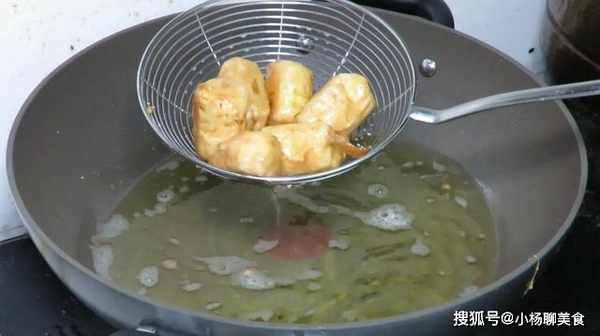 4、鍋中倒入適量的油,加熱油將油溫加熱至七成熱時放入香蕉,將香蕉炸成金黃色之後撈出備用,