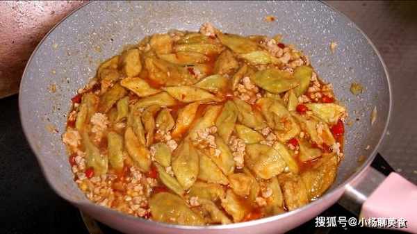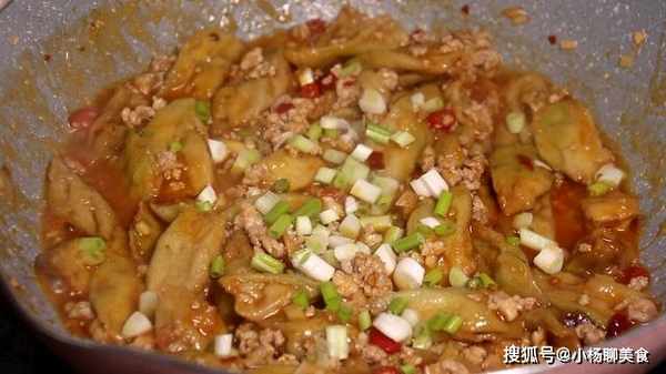5、烹飪食材:鍋中留底油放入肉末,將肉末炒散炒至發白,放入葱薑小米辣,放一勺豆瓣醬,加入適量清水,放生抽,料酒,味精,鹽,白糖提鮮,再放點胡椒粉,大火燒開,放入炸好的茄子,中火煮一分鐘,倒入水澱粉勾芡一下,大火收汁,湯汁濃稠就可以了,最後撒點葱末