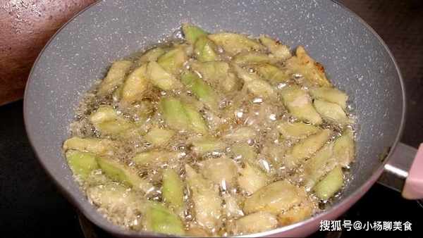 4、炸茄子:鍋中倒入油,油燒熱放入茄子,大火將茄子炸至微黃,老出來控油