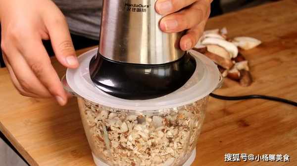 1、把香菇的根去掉,將香菇先切一下,切成塊,香菇放絞肉機裡面,將香菇打碎,這樣打的香菇更碎,而且方便了許多