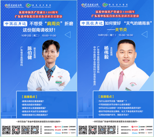 10月12日是世界關節炎日,廣東省中醫院聯合家庭醫生線上關注老年人的關節問題,推出關節炎保健直播轉場,邀請了廣東省中醫院骨科副主任醫師陳伯健、運動醫學科主任醫師楊偉毅,於10月12日10:30-11:30、15:00-16:00兩個時間段進行直播,聚焦老年人的肩周炎、關節炎等疾病的相關問題,為大家科普正確的預防和治療方法,歡迎大家準時收看!
