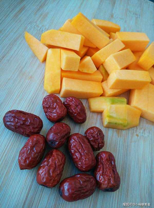 我們做這道南瓜紅棗湯的時候,先把需要的原材料準備下,南瓜,紅棗,冰糖,清水。