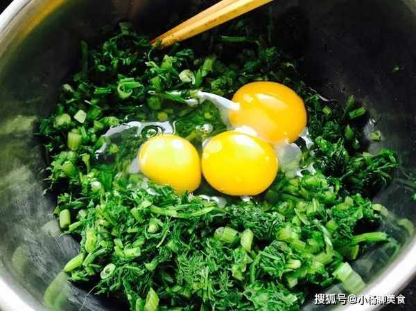 步驟三,接下來,把雞蛋打散在茴香苗上,放上鹽,胡椒粉,小葱洗淨切成圈,放進去。