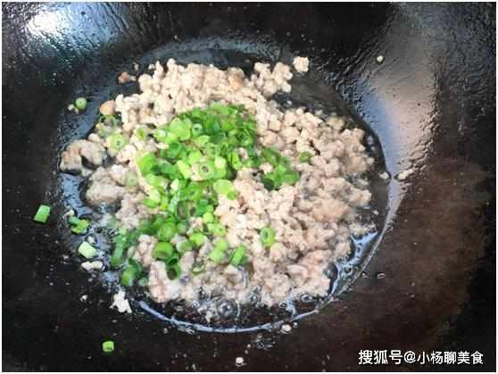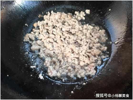 第五步:鍋中倒入適量油,油熱後放入肉末炒至變色。