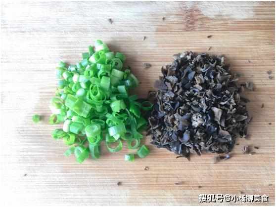 第四步:將小葱切成蔥花,木耳泡發後切碎。