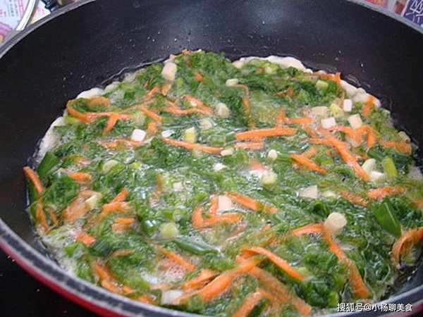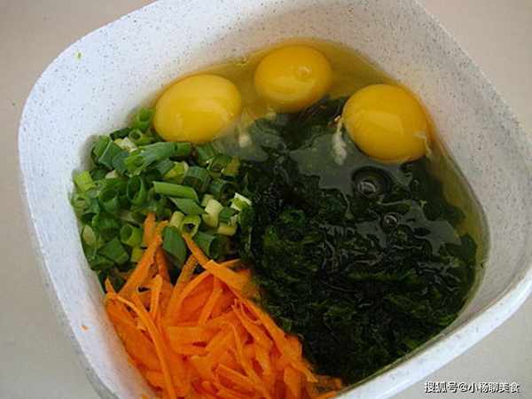 放點蔥花和紅蘿蔔絲~~這樣煎起來卡水啦~!!(我用肚臍想也知道~~)