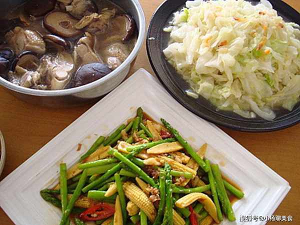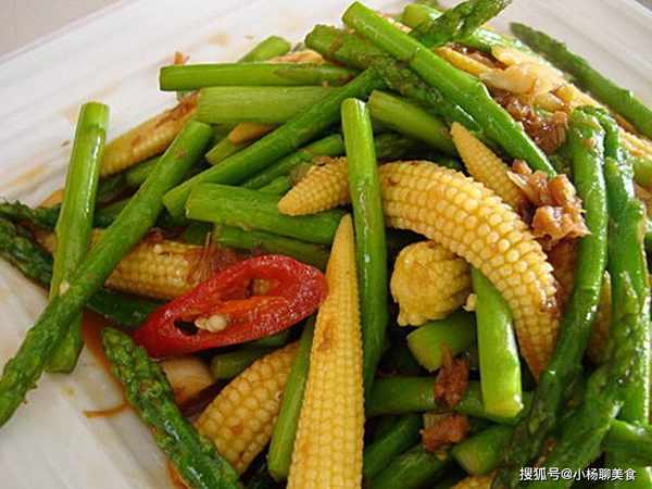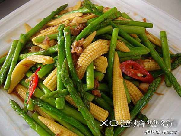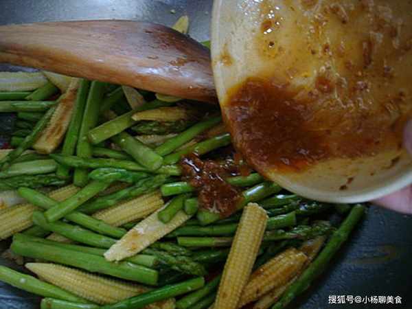 往常我的做法是~~先爆香蒜頭辣椒,然後放下蘆筍、玉米笋~~炒一下
