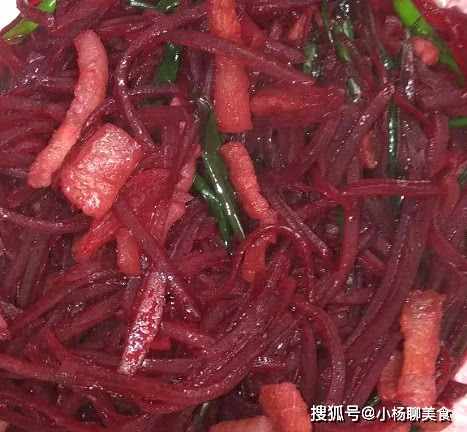 紅菜根先處理下放在清水中洗淨切成絲,緊接著將猪肉洗淨切成塊,順手把大蒜去皮切成顆粒,起鍋倒入適量的菜籽油,當油溫燒到6成的時候,要把大蒜放進去,用小火炒香,再把切好的猪肉放進去翻炒,等到炒到變色之後呢,這個時候要把紅菜根放進去,繼續翻炒2分鐘左右,加鹽和雞精進去調味,等到食材入味之後呢,就可以裝盤了,幾分鐘輕鬆端上桌。