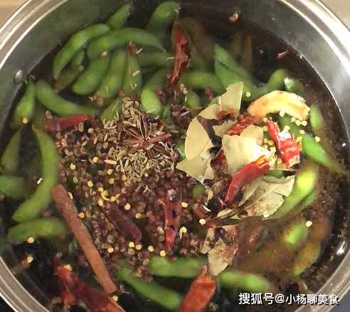 毛豆是一道很普通的蔬菜,經常出現在大家的餐桌上,今天小饞貓帶來的五香毛豆也是非常的簡單,需要的食材都是常見的,我們做這道菜的時候,先準備一些毛豆,鹽,八角,幹辣椒,桂皮,茴香,食用鹽,沙拉油。我們要先把毛豆放在清水中,加點食用鹽進去,用手將毛豆清洗乾淨,撈出來備用。鍋中加入適量的清水進去,大火燒開之後呢,緊接著把準備好的調料幹辣椒,桂皮,茴香,八角,香葉放進去,煮上3分鐘左右。