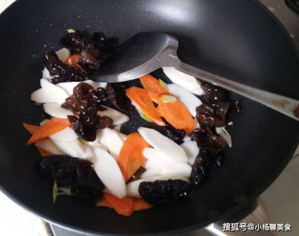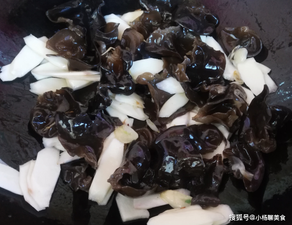 3,起鍋後,先把食用油放鍋中,油溫高了後,要把山藥倒入鍋中,快速的翻炒後,加上木耳一起。