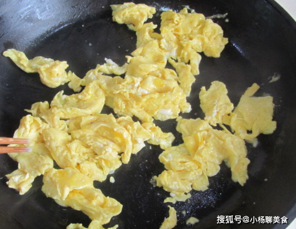 3,起鍋後,將食用油倒入鍋中,先把雞蛋放進去,炒熟後,裝盤備用。