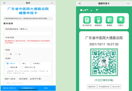 2021年10月19日起,廣東省中醫院啟用就醫健康申報卡與電子陪護證,流行病學史問卷實現無紙化!