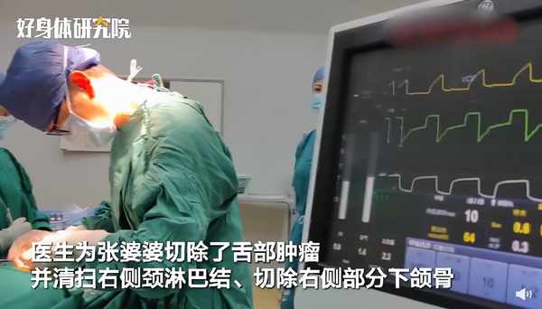 隨後醫生給張婆婆切除了舌部腫瘤,同時清掃右側頸淋巴結、切除右側部分下頷骨。同時醫生提醒:日常口腔問題需要重視,若超過一個月不癒合就需要及時就診。