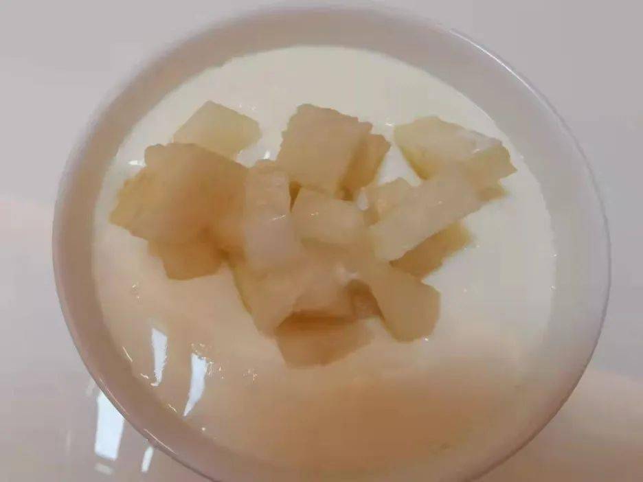 ⑤把雪梨去皮切粒,鋪在做好的雙皮奶上即可。